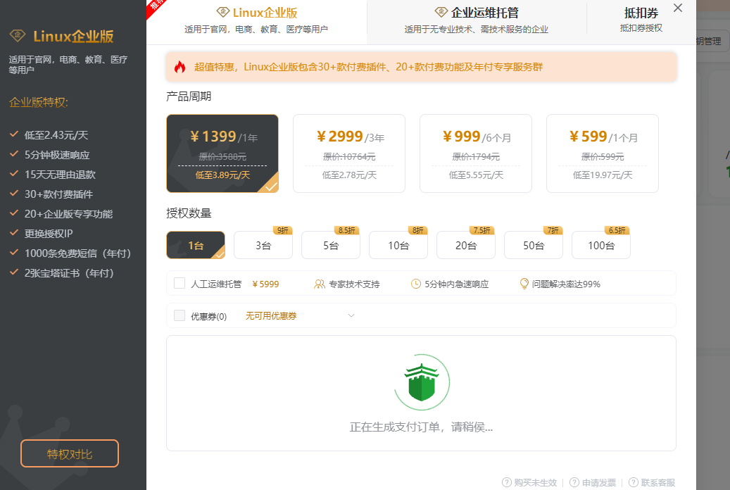 当年给宝塔直接好像是800左右买的终生版, 现在人家都是按年付费了。